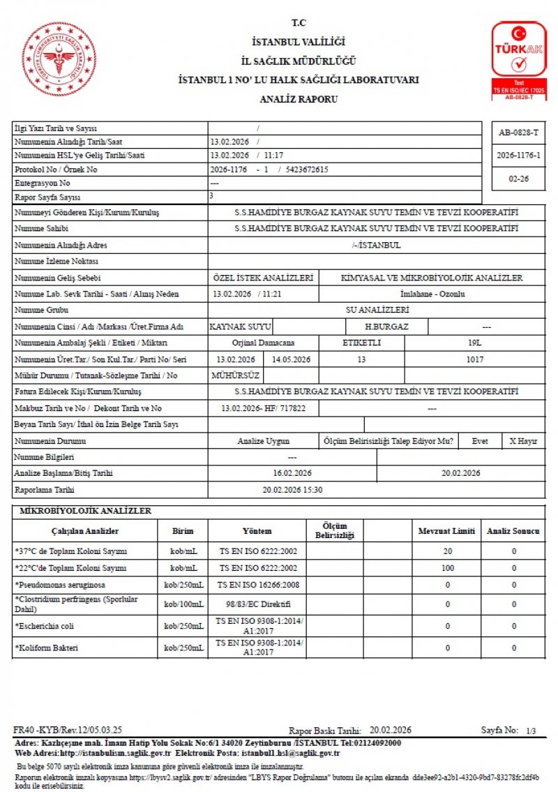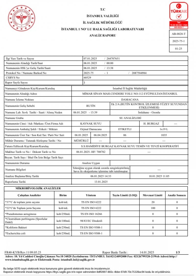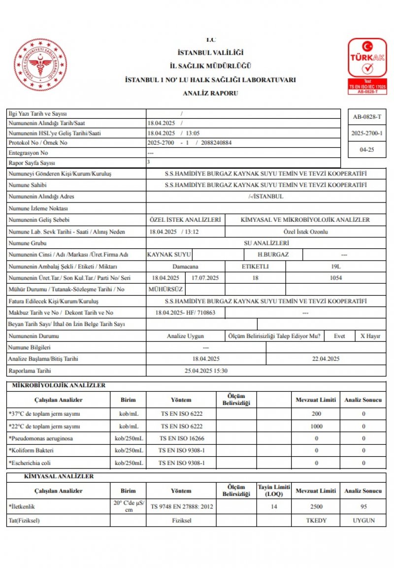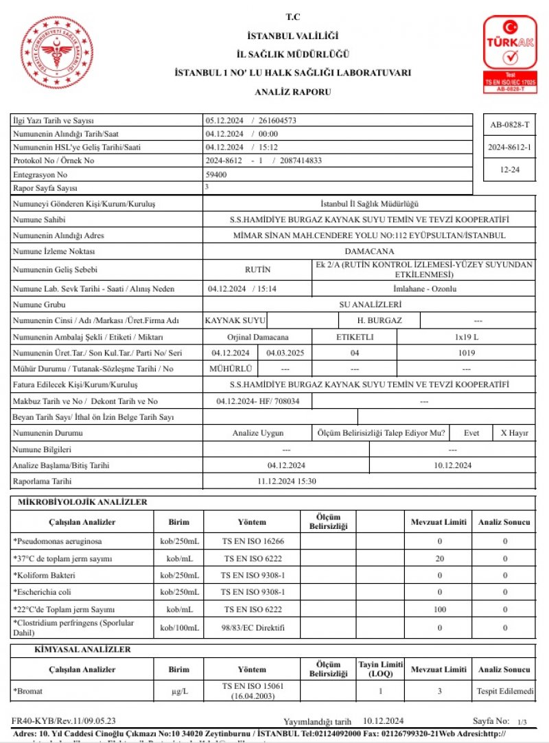 Kaynak suyumuzun günlük organoleptik,fiziksel ve kimyasal analizleri tesisimizde bulunan laboratuarımızda yapılmaktadır.Bu analizler üretime başlamadan önce; kaynaktan,depolardan ve nihai çıkış noktasından ayrı ayrı numuneler alınarak titizlikle aksatılmadan yapılmaktadır.Belirli periyotlarda suyun temas ettiği her noktadan mikrobiyolojik analizler yapılarak , suyun hiçbir şekilde kontaminasyonuna izin verilmeden üretimi sağlanmaktadır. Kaynaktan su dolumuna kadar bütün kalite kontrolleri yapılmış olan kaynak suyumuz,depolarımızda hepa filtrelerle korunmaktadır.Böylece kaynak suyumuz hiçbir bakteri oluşumuna izin verilmeden su dolum hattına aktarılmaktadır.