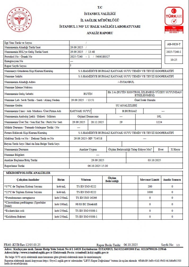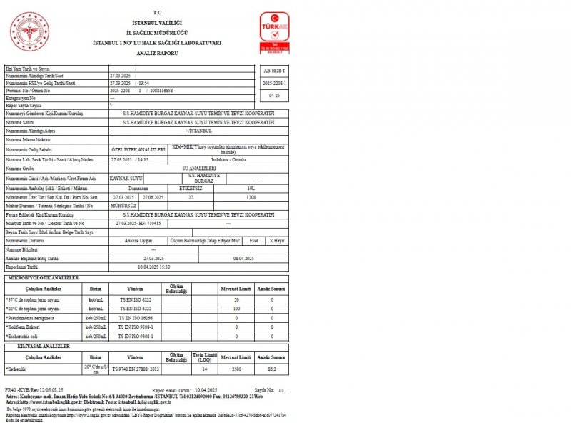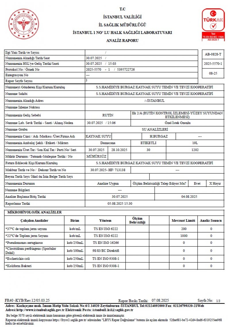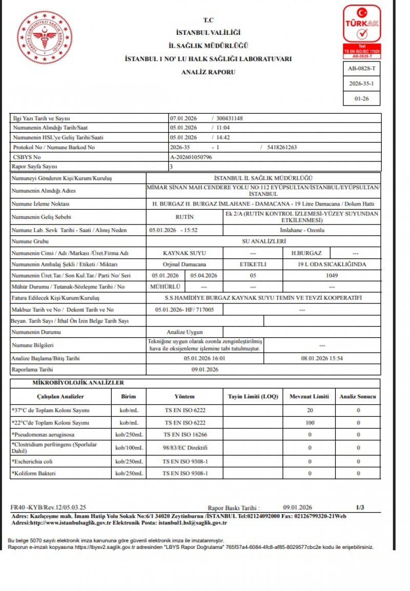 Kaynak suyumuzun günlük organoleptik,fiziksel ve kimyasal analizleri tesisimizde bulunan laboratuarımızda yapılmaktadır.Bu analizler üretime başlamadan önce; kaynaktan,depolardan ve nihai çıkış noktasından ayrı ayrı numuneler alınarak titizlikle aksatılmadan yapılmaktadır.Belirli periyotlarda suyun temas ettiği her noktadan mikrobiyolojik analizler yapılarak , suyun hiçbir şekilde kontaminasyonuna izin verilmeden üretimi sağlanmaktadır. Kaynaktan su dolumuna kadar bütün kalite kontrolleri yapılmış olan kaynak suyumuz,depolarımızda hepa filtrelerle korunmaktadır.Böylece kaynak suyumuz hiçbir bakteri oluşumuna izin verilmeden su dolum hattına aktarılmaktadır.