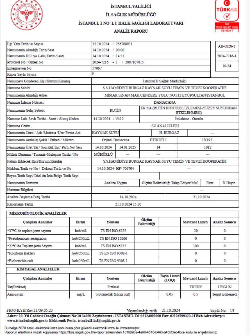 Kırbalarla başladığımız mesleğimiz,günümüz teknolojisinin sunduğu olanakları en iyi şekilde kullanarak aynı titizlik ve kaliteyle devam etmektedir. Gıda Güvenliği Yönetim Sistemleri ile ilgili dökümantasyon sistemi mevcut olup;kaliteli üretim,tam hijyen ve laboratuvar uygulamaları eksiksiz ve töleranssız olarak gerçekleştirilmektedir. Gıda güvenliği için gerekli tüm kontrol noktalarını oluşturmak ve tam hijyenik ürün sunmak,gıda güvenliğini tehlikeye sokabilecek her aşamada önlem almak ilk ve değişmez kalite prensibimizdir. Kaynaklarımız Sultan Hamid zamanında yapılan yerleşim yerlerinden tamamen uzakta,ormanda özel koruma alanları içerisindedir. Türkiye-TSE Türk Standartları Enstitüsü’nün ‘Türk İçme Suyu Standartları’ ve TC Sağlık Bakanlığı’nın ‘insani Tüketim Amaçlı Sular Hakkında Yönetmelik’ hükümlerine uygun olarak üretim yapmaktayız.